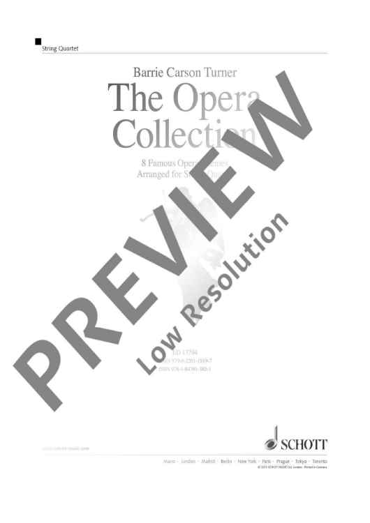 Author and arranger Barrie Carson Turner presents a selection of 8 Famous Opera themes arranged for string quartet. The collection includes: Non più andrai (Mozart), Intermezzo (Mascagni), Toreador Song (Bizet), Oh! mio babbino caro (Puccini), Lascia ch’io pianga (Händel), Chorus of the Hebrew Slaves (Verdi), Bei Männern, welche Liebe fühlen (Mozart), and Per poco fra le tenebre (Donizetti). The collection comes with separate part inserts for each instrument.