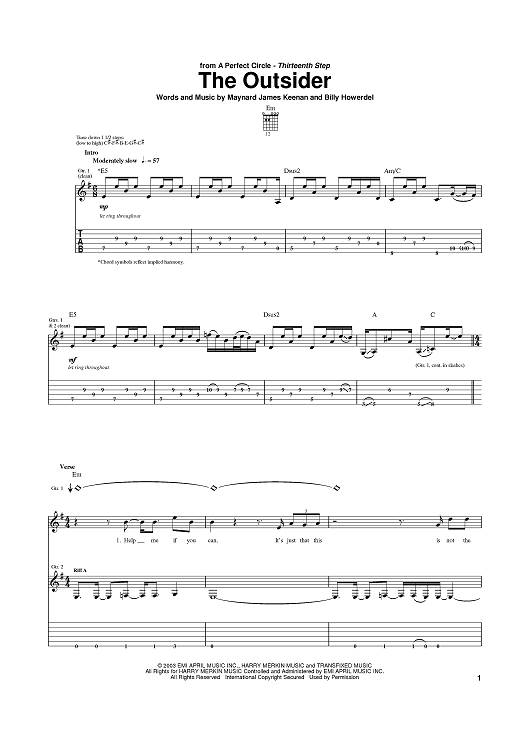 Digital Sheet Music for The Outsider by Maynard James Keenan, Billy Howerdel, A Perfect Circle scored for Guitar Tab; id:375312