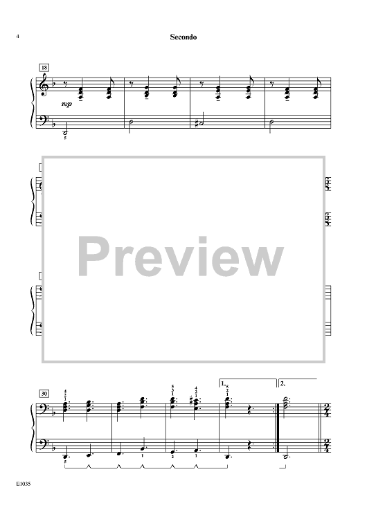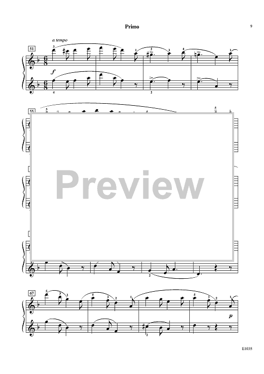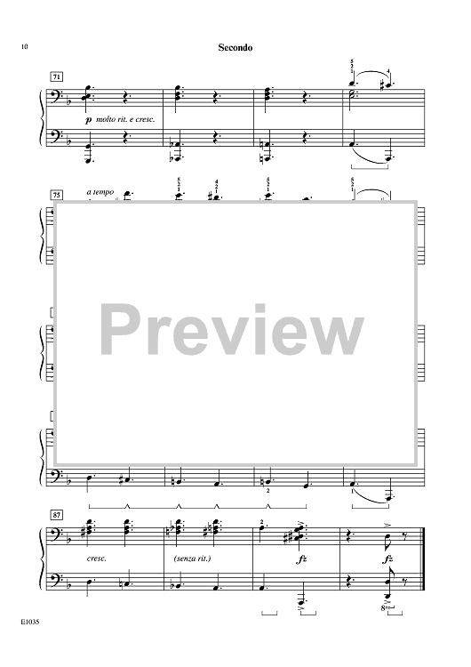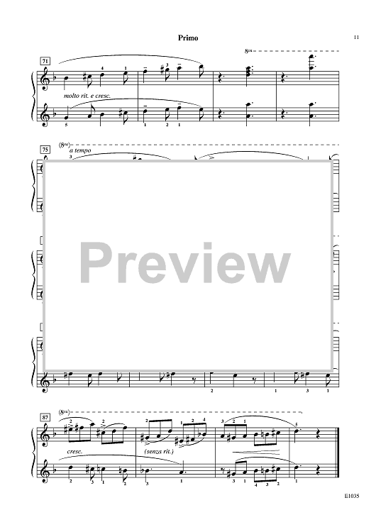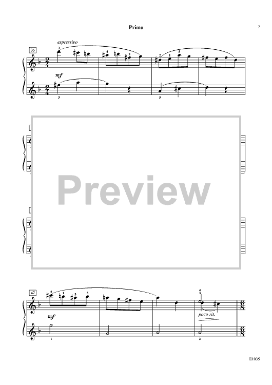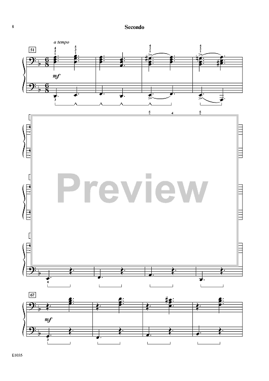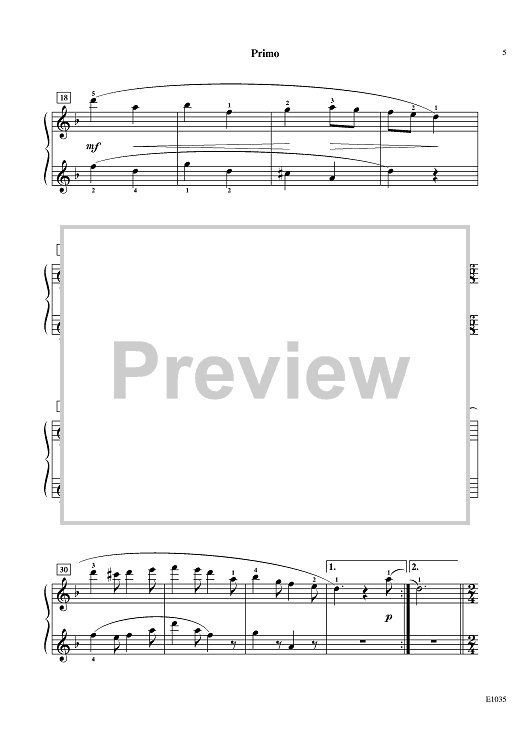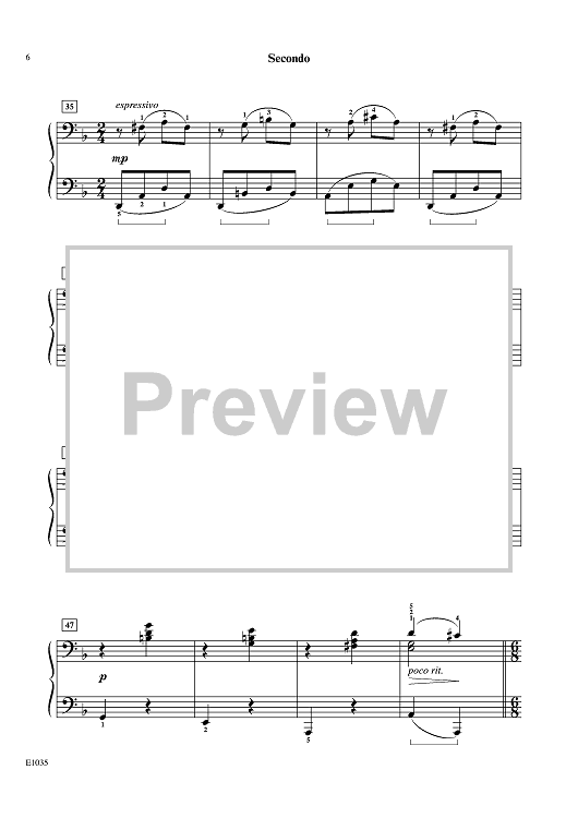 An intermediate duet for one piano, four hands, this exciting piece is played in the key of D minor using 6/8 and 2/4 time. The primo and secondo take turns with the melody and includes a surprise ending that's harmonically in a somewhat blues-style.