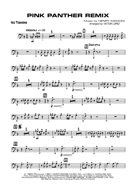 Digital Sheet Music for The Pink Panther Remix - Trombone 3 by Henry Mancini, Victor Lopez scored for Jazz Ensemble; id:358898