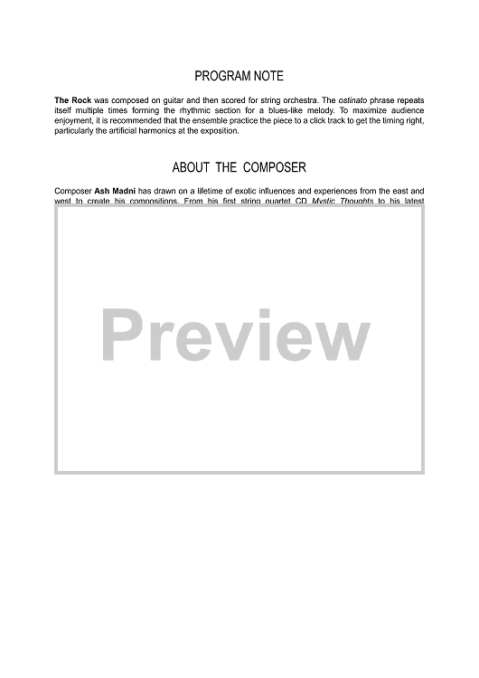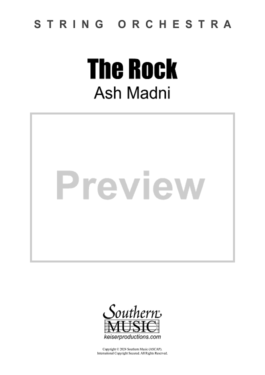 "THE ROCK" was composed on guitar and then scored for string orchestra. The ostinato phrase repeats itself multiple times forming the rhythmic section for a blues-like melody. To maximize audience enjoyment, it is recommended that the ensemble practice the piece to a click track to get the timing right, particularly the artificial harmonics at the exposition.