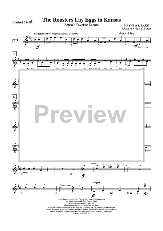 Digital Sheet Music for The Roosters Lay Eggs In Kansas - Clarinet 3 in B-flat by Mayhew Lake scored for Concert Band; id:409241