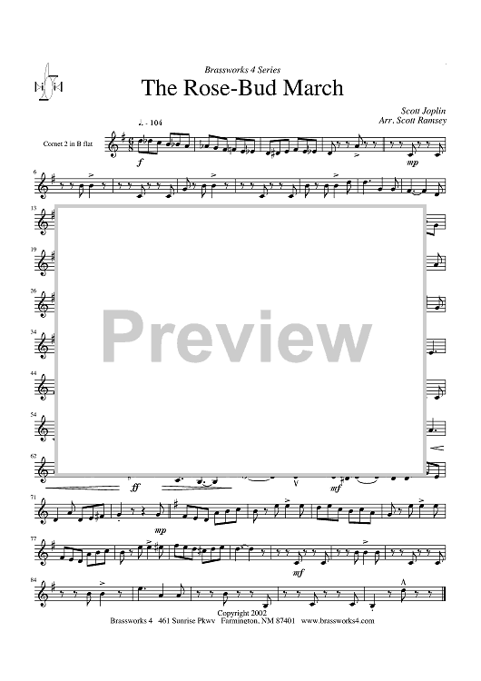 Digital Sheet Music for The Rose-Bud March - Cornet 2/Trumpet 2 by Scott Joplin, Scott A. Ramsey scored for Brass Quartet; id:316754