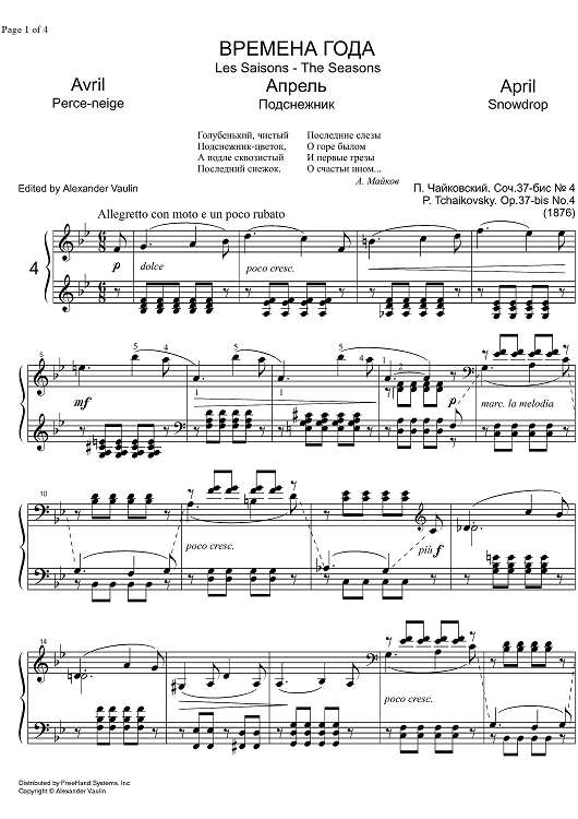 "The Seasons. No. 4. April. Snowdrop" Sheet Music by Peter Ilyich Tchaikovsky