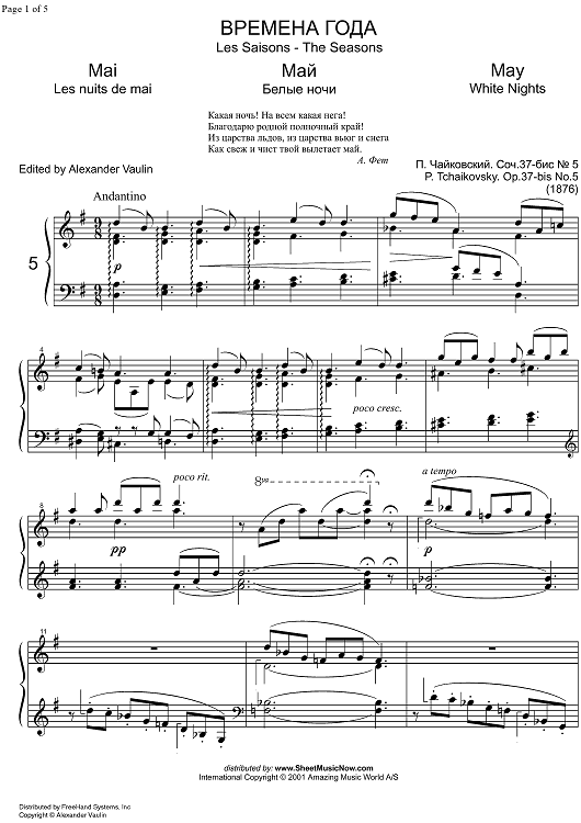 "The Seasons. No. 5. May. White Nights" Sheet Music by Peter Ilyich Tchaikovsky