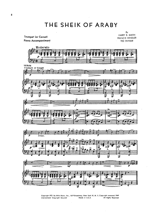 Digital Sheet Music for The Sheik Of Araby - Piano Accompaniment by , Ted Snyder, Harry B. Smith, Francis Wheeler scored for Trumpet/Piano; id:423211