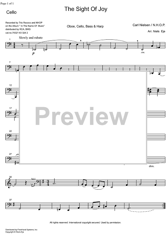 Digital Sheet Music for The Sight of Joy - Cello by Niels Eje, Carl Nielsen scored for Oboe/Cello/Bass/Harp; id:324319