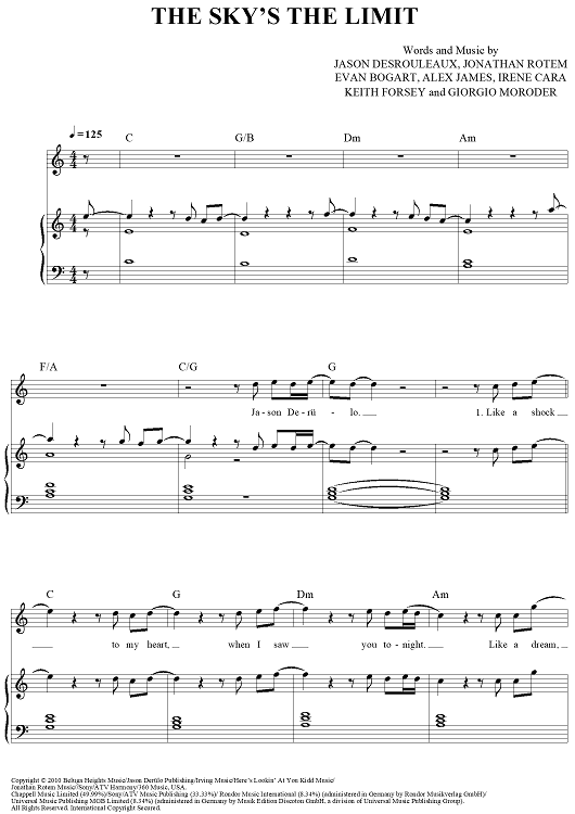 Digital Sheet Music for The Sky's the Limit by Irene Cara, Giorgio Moroder, Keith Forsey, Jonathan Rotem, Alex James, Jason Derulo, Evan Bogart scored for Piano/Vocal/Chords; id:449540
