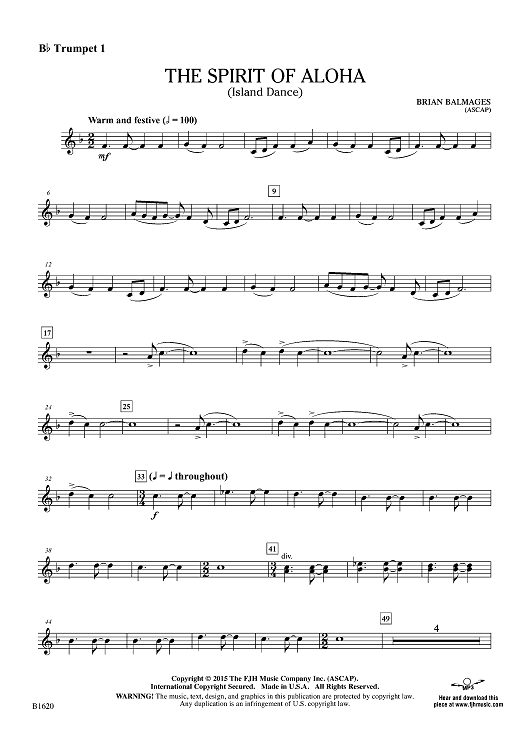 Digital Sheet Music for The Spirit of Aloha (Island Dance) - Bb Trumpet 1 by Brian Balmages scored for Concert Band; id:454607
