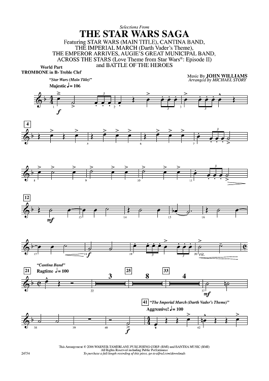 Digital Sheet Music for The Star Wars Saga, Selections from - Trombone in B-flat TC by John Williams, Michael Story scored for Concert Band; id:403875