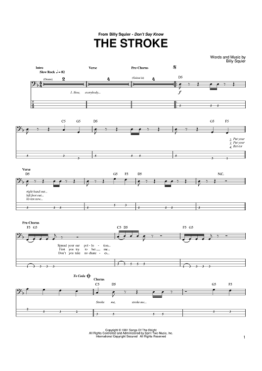 Digital Sheet Music for The Stroke by Billy Squier scored for Bass Tab; id:383179