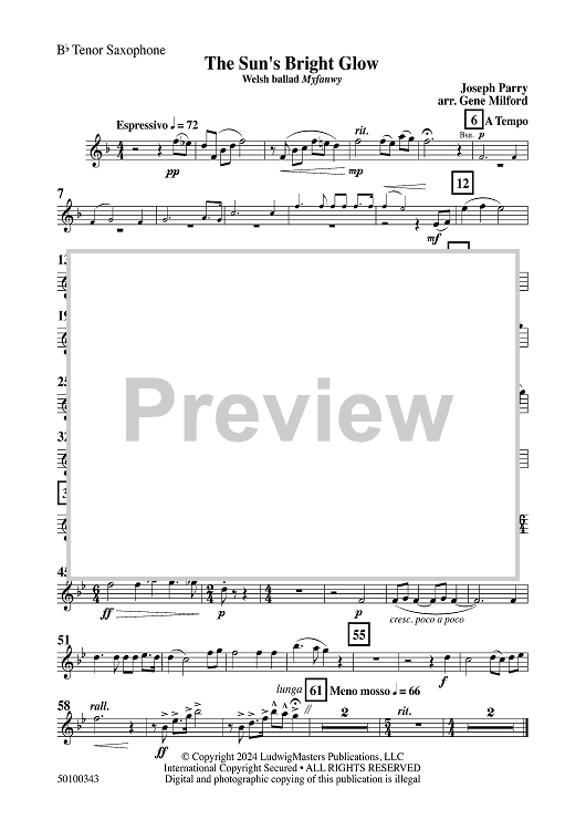 Digital Sheet Music for The Sun's Bright Glow - Bb Tenor Sax by Gene Milford, Joseph Parry scored for Concert Band; id:504553