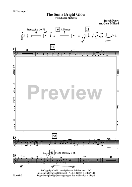 Digital Sheet Music for The Sun's Bright Glow - Bb Trumpet 1 by Gene Milford, Joseph Parry scored for Concert Band; id:504555