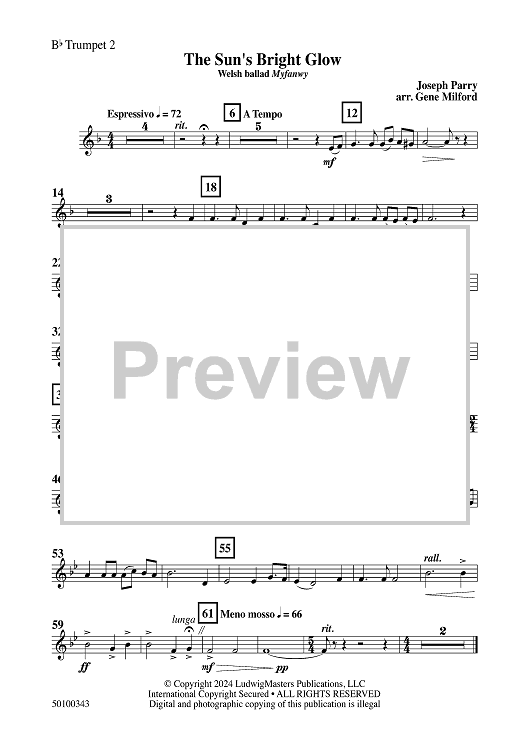 Digital Sheet Music for The Sun's Bright Glow - Bb Trumpet 2 by Gene Milford, Joseph Parry scored for Concert Band; id:504556