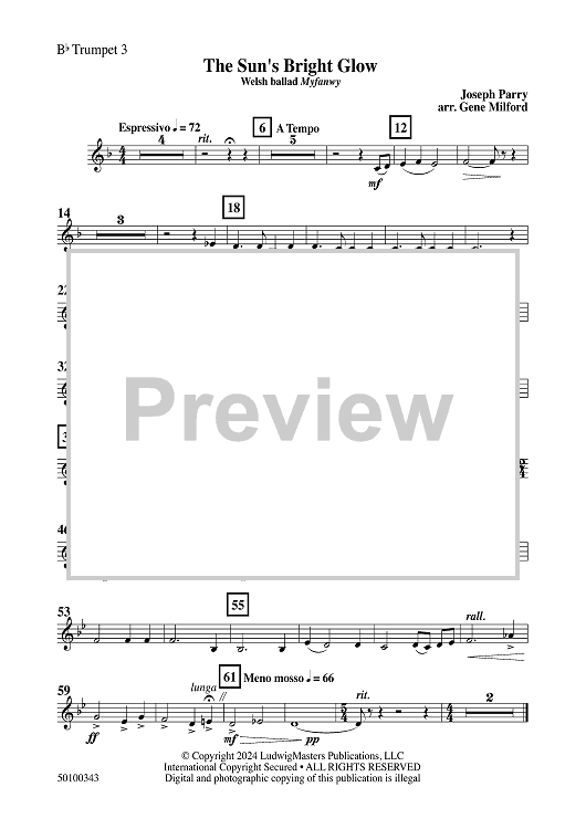Digital Sheet Music for The Sun's Bright Glow - Bb Trumpet 3 by Gene Milford, Joseph Parry scored for Concert Band; id:504557
