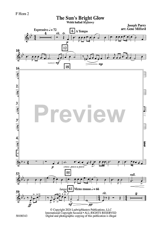 Digital Sheet Music for The Sun's Bright Glow - F Horn 2 by Gene Milford, Joseph Parry scored for Concert Band; id:504559