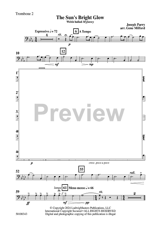 Digital Sheet Music for The Sun's Bright Glow - Trombone 2 by Gene Milford, Joseph Parry scored for Concert Band; id:504561