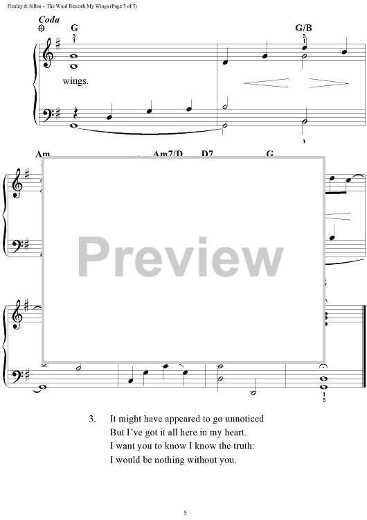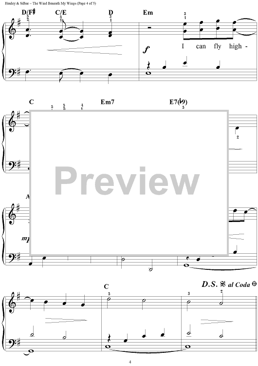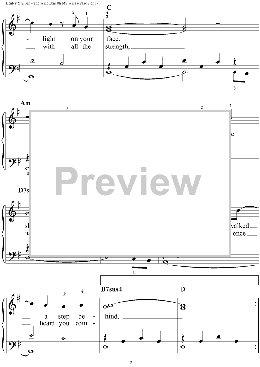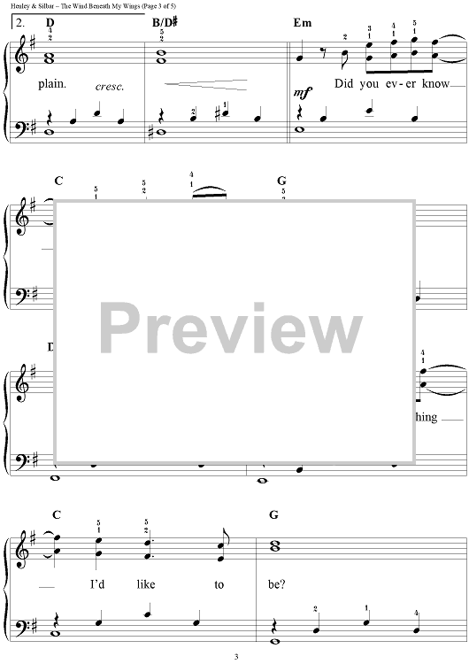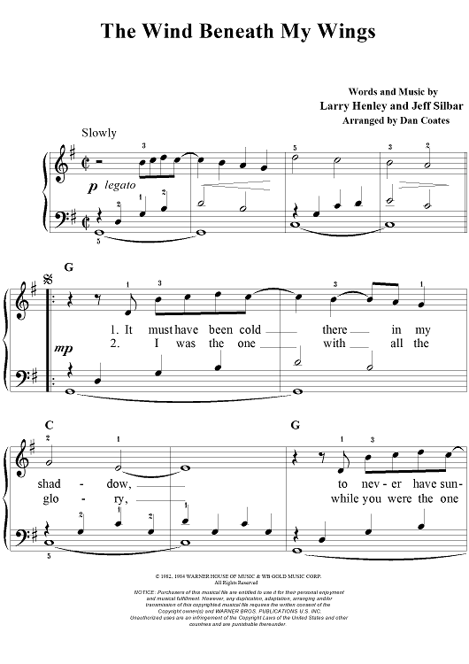 Digital Sheet Music for The Wind Beneath My Wings by Larry Henley, Jeff Silbar, Dan Coates, Bette Midler scored for Easy Piano/Vocal; id:94991
