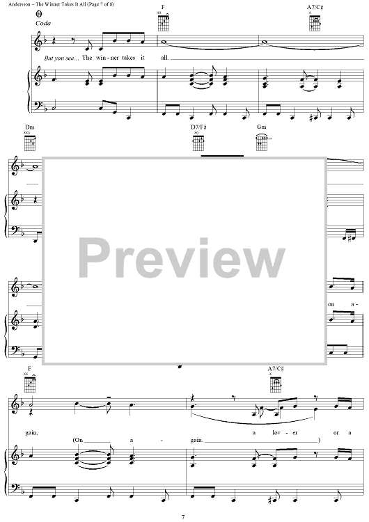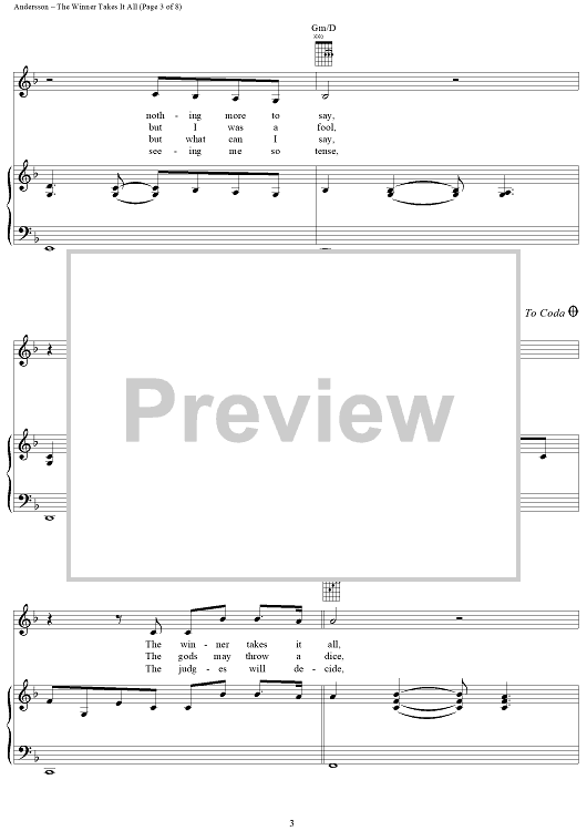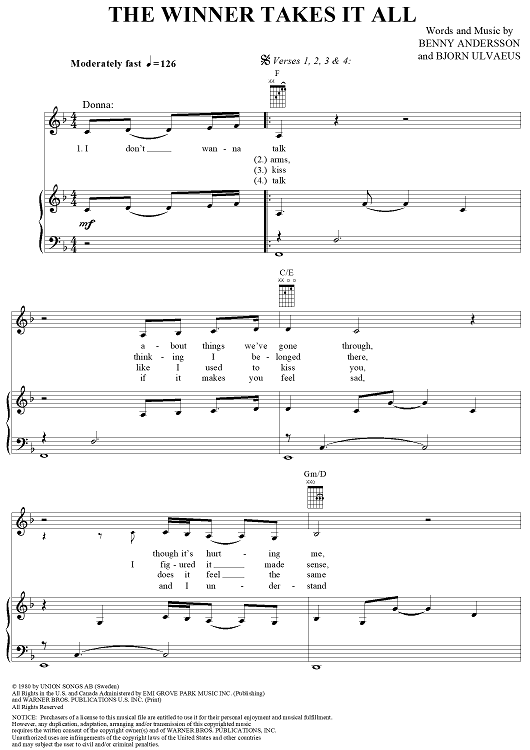 Digital Sheet Music for The Winner Takes It All by ABBA, Benny Andersson, Bjorn Ulvaeus scored for Piano/Vocal/Chords; id:314980
