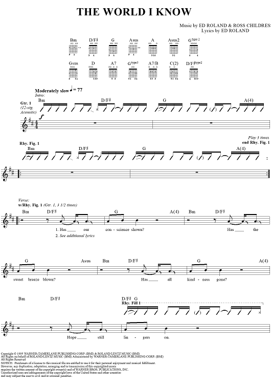 Digital Sheet Music for The World I Know by Collective Soul, Ed Roland, Ross Childress scored for Guitar Tab/Vocal; id:113920