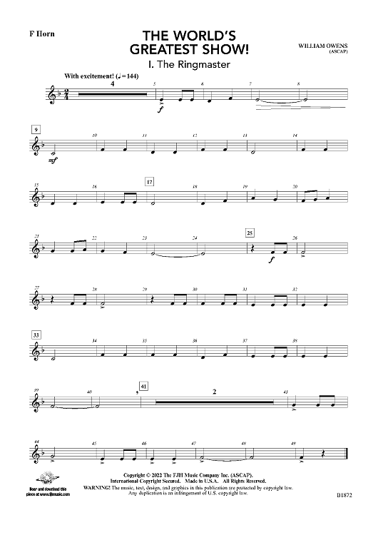 Digital Sheet Music for The World’s Greatest Show! - F Horn by William Owens scored for Concert Band; id:498586