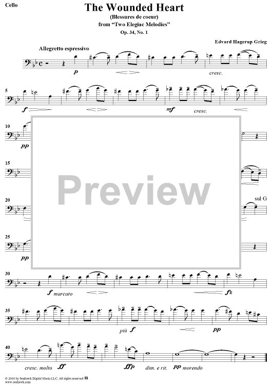 Digital Sheet Music for The Wounded Heart, No. 1 from "Two Elegiac Melodies", Op. 34 - Cello by Edvard Grieg scored for Cello/Piano; id:303878