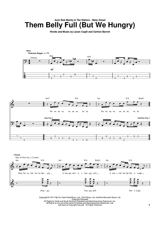 Digital Sheet Music for Them Belly Full (But We Hungry) by Bob Marley, Carlton Barrett, Lecon Cogill scored for Bass Tab; id:371294
