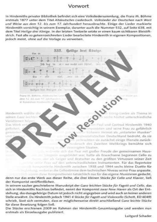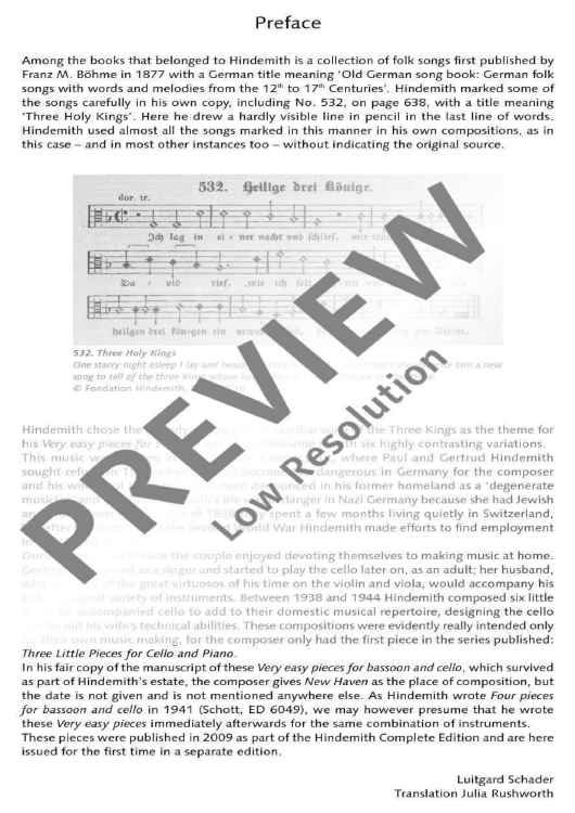 Hindemith's 'Very easy pieces for bassoon and violoncello' were created in New Haven, probably between 1941 and 1944. It was particularly in his years of exile that he liked to make music at home with his wife Gertrud who played cello. Hindemith himself accompanied her on various instruments, being known as a skilled bassoonist among others. The old folk song 'Ich lag in einer Nacht und schlief' is performed in six variations, arranged in a chorale-like, humorous or polyphonic manner. The parts are rewarding for both players. First edition based on the Hindemith Complete Edition.