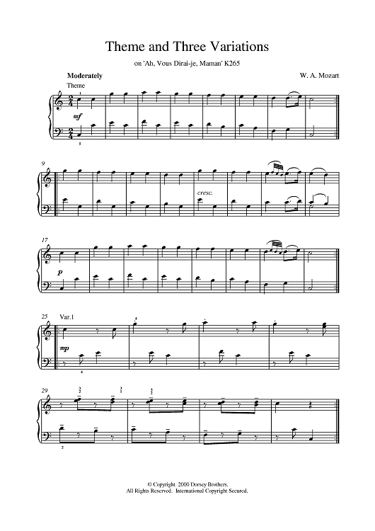 Digital Sheet Music for Theme and Three Variations on 'Ah, Vous Dirai-je, Maman' K265 by Wolfgang Amadeus Mozart scored for Piano; id:385905