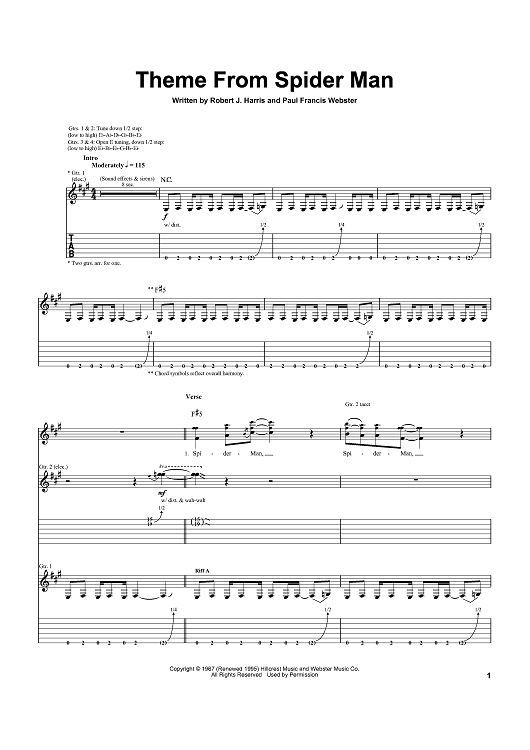 Digital Sheet Music for Theme From Spider-Man by Paul Francis Webster, Bob Harris scored for Guitar Tab; id:397159