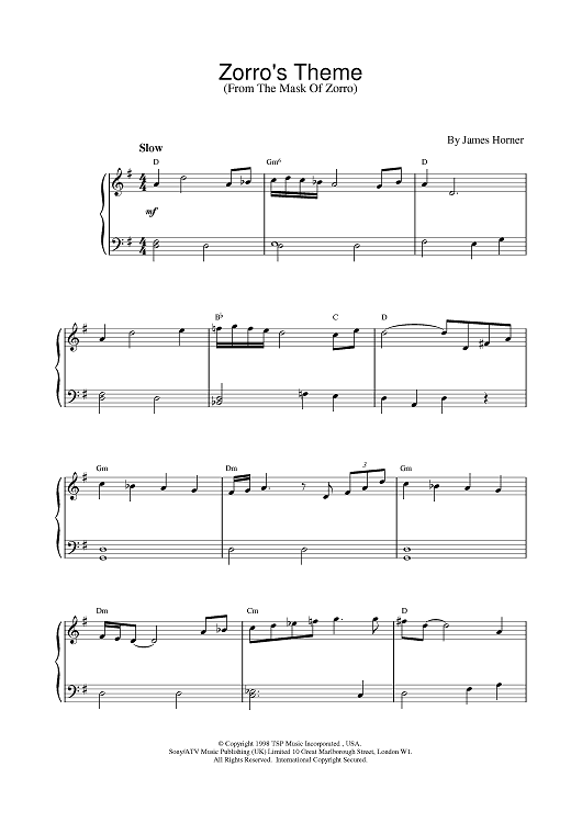 Digital Sheet Music for Theme From Zorro by James Horner scored for Piano; id:380840