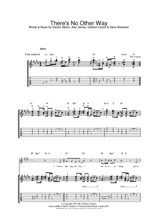 Digital Sheet Music for There's No Other Way by Blur scored for Guitar Tab; id:381659