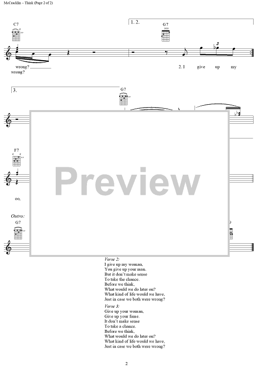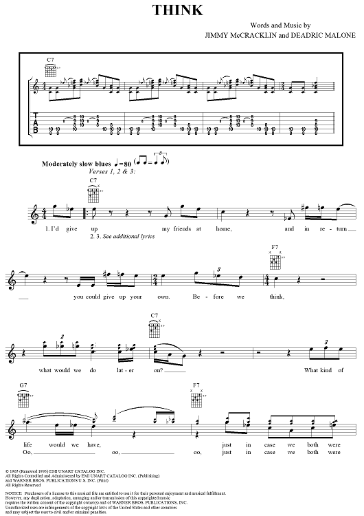 Digital Sheet Music for Think by Jerry Garcia, Deadric Malone, Jimmy McCracklin scored for Easy Guitar Tab/Vocal; id:291732
