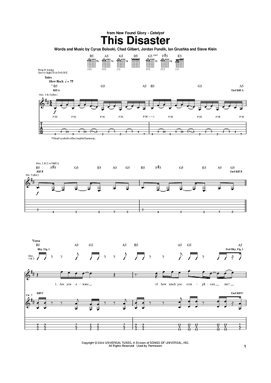 Digital Sheet Music for This Disaster by New Found Glory, Cyrus Bolooki, Chad Gilbert, Ian Grushka, Steve Klein, Jordan Pundik scored for Guitar Tab; id:375182