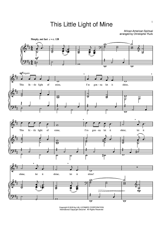 Digital Sheet Music for This Little Light Of Mine by African American Spiritual, Christopher Ruck scored for Piano/Vocal/Chords; id:385052