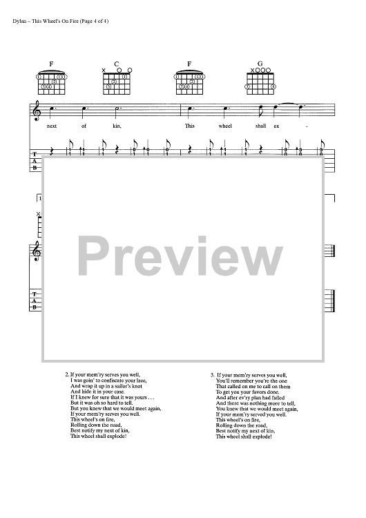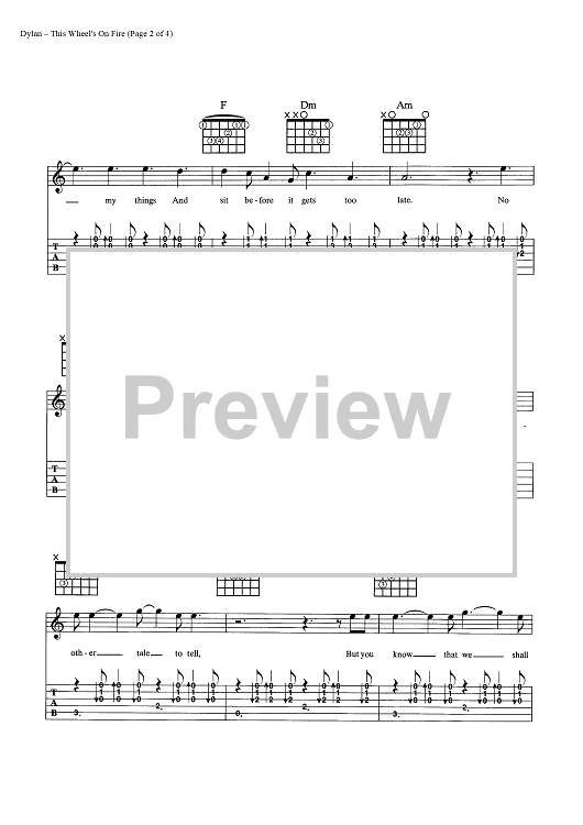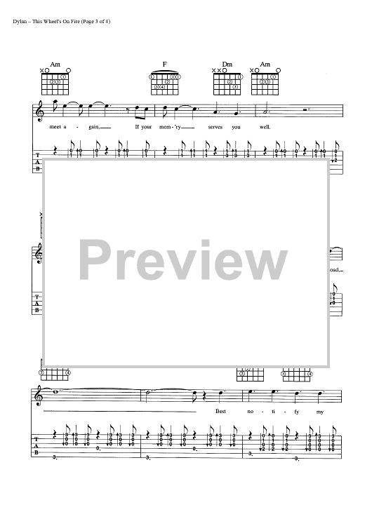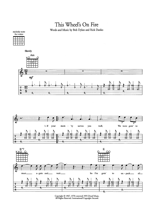 Digital Sheet Music for This Wheel's On Fire by Bob Dylan, Rick Danko scored for Guitar Tab/Vocal/Chords; id:445477