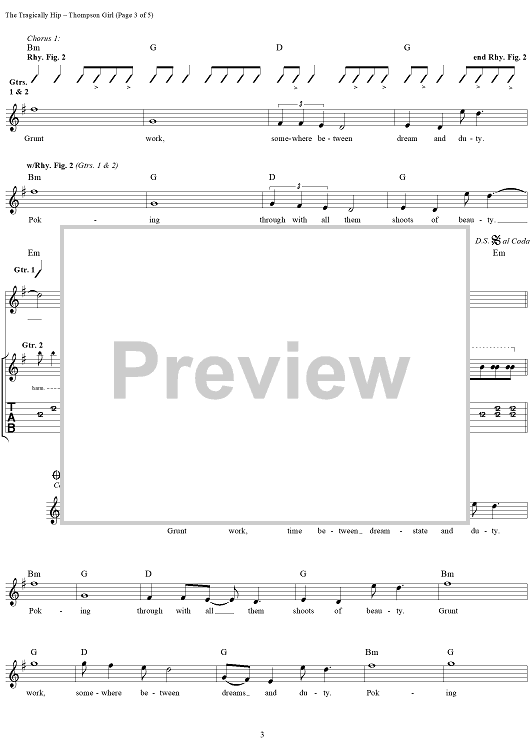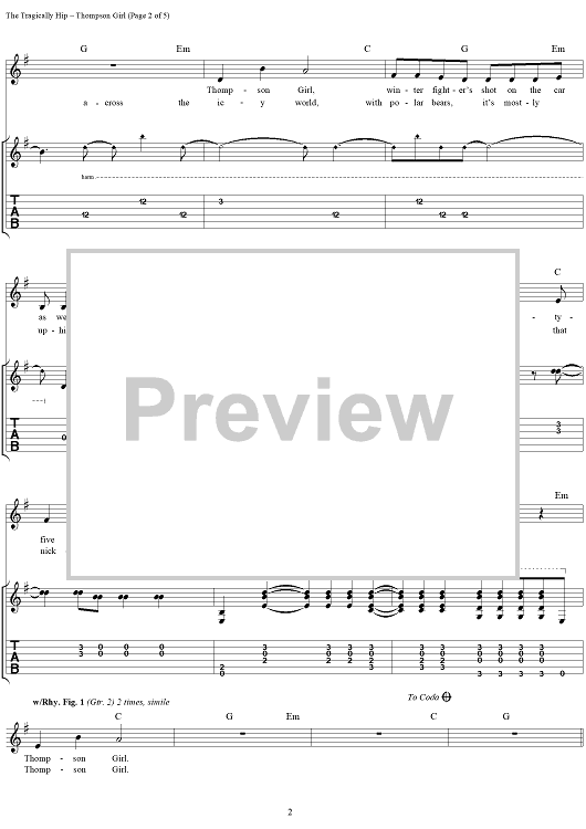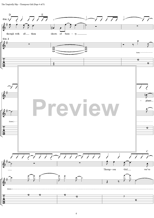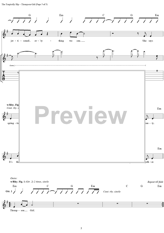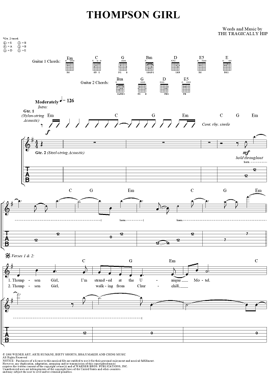 "Thompson Girl" Sheet Music by The Tragically Hip
