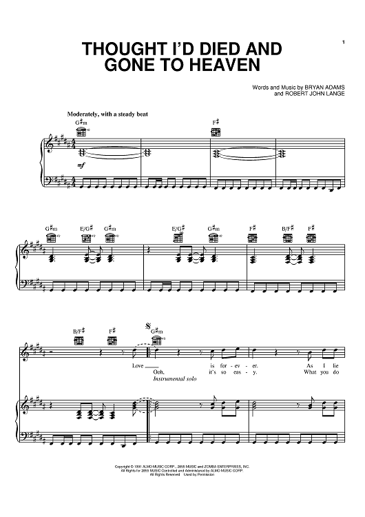 Digital Sheet Music for Thought I'd Died And Gone To Heaven by Bryan Adams, Robert Lange scored for Piano/Vocal/Chords; id:367746