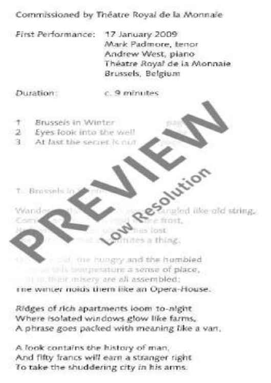 'Three Auden Songs' was commissioned by Theatre Royal de la Monnaie for the tenor Mark Padmore and the pianist Andrew West who gave the first performance in Brussels in 2009. Lyricism and clarity are its defining characteristics, and a strong feeling for both voice and accompaniment that comes naturally to this fine composer/pianist.