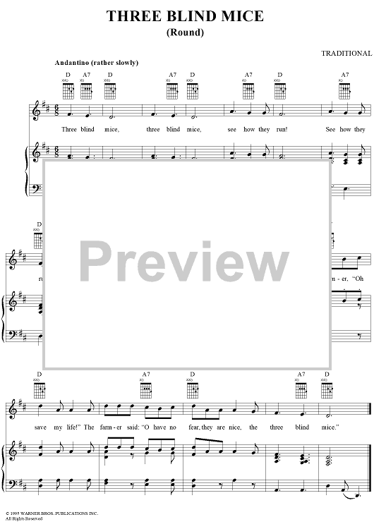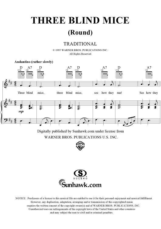 Digital Sheet Music for Three Blind Mice (Round) by Traditional scored for Piano/Vocal/Chords; id:260497
