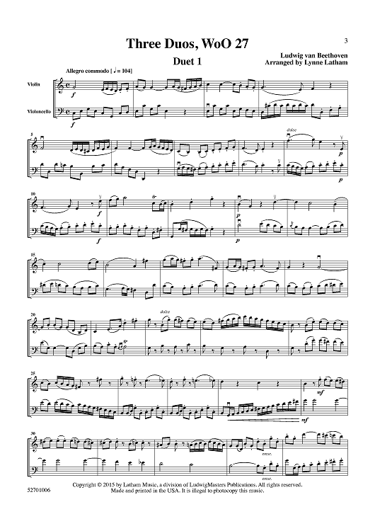 Digital Sheet Music for Three Duos, WoO 27 for Violin and Cello - Score by , Ludwig van Beethoven, Lynne Latham scored for Violin and Cello; id:462519
