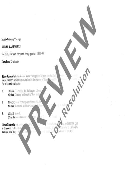 Digital Sheet Music for Three Farewells - Full Score by Mark-Anthony Turnage scored for Flute, Bass-clarinet, Harp And String Quartet; id:474567
