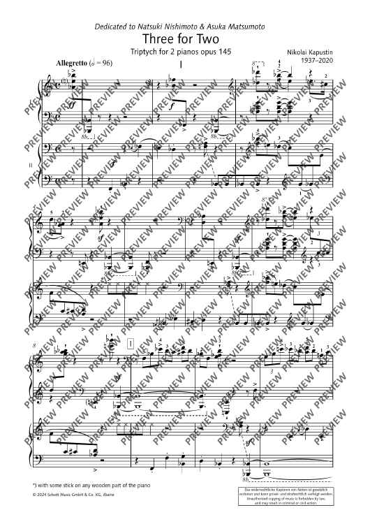 Three for Two. Triptych for 2 pianos op. 145 was written by Kapustin in 2012 for the Japanese piano duo PiaNA, consisting of Natsuki Nishimoto and Asuka Matsumoto.