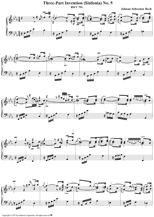 Digital Sheet Music for Three-Part Invention, no. 5: Sinfonia in E-flat major by Johann Sebastian Bach scored for Piano Solo; id:95149