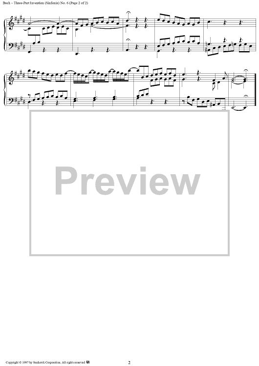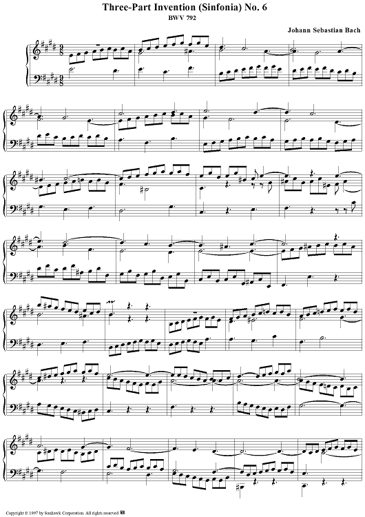 Digital Sheet Music for Three-Part Invention, no. 6: Sinfonia in E major by Johann Sebastian Bach scored for Piano Solo; id:95150