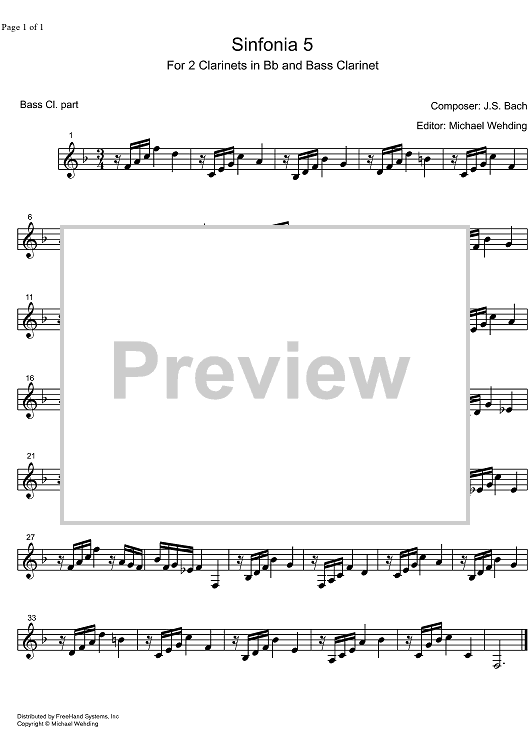 "Three Part Sinfonia No. 5 BWV 791 Eb Major - Bass Clarinet" Sheet Music by Johann Sebastian Bach