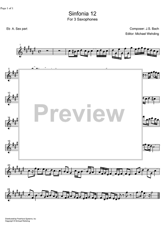 Digital Sheet Music for Three Part Sinfonia No.12 BWV 798 A Major - E-flat Alto Saxophone by , Johann Sebastian Bach, Michael Wehding scored for Saxophone Trio; id:324408
