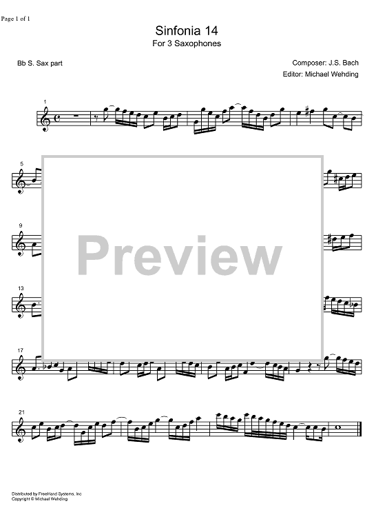 Digital Sheet Music for Three Part Sinfonia No.14 BWV 800 Bb Major - B-flat Soprano Saxophone by , Johann Sebastian Bach, Michael Wehding scored for Saxophone Trio; id:324425