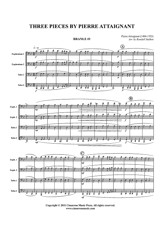 Digital Sheet Music for Three Pieces by Pierre Attaingnant - Score by Pierre Attaingnant, Randy Stulken scored for Tuba Quartet; id:425208