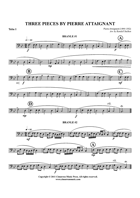 Digital Sheet Music for Three Pieces by Pierre Attaingnant - Tuba 1 by Pierre Attaingnant, Randy Stulken scored for Tuba Quartet; id:425211